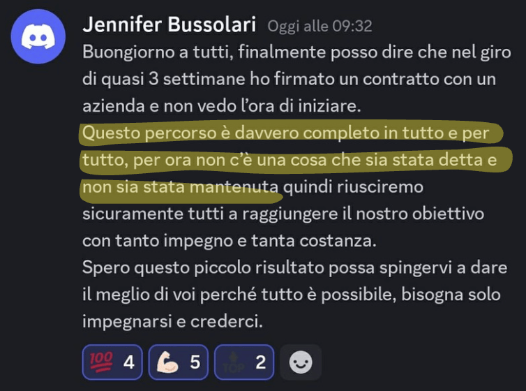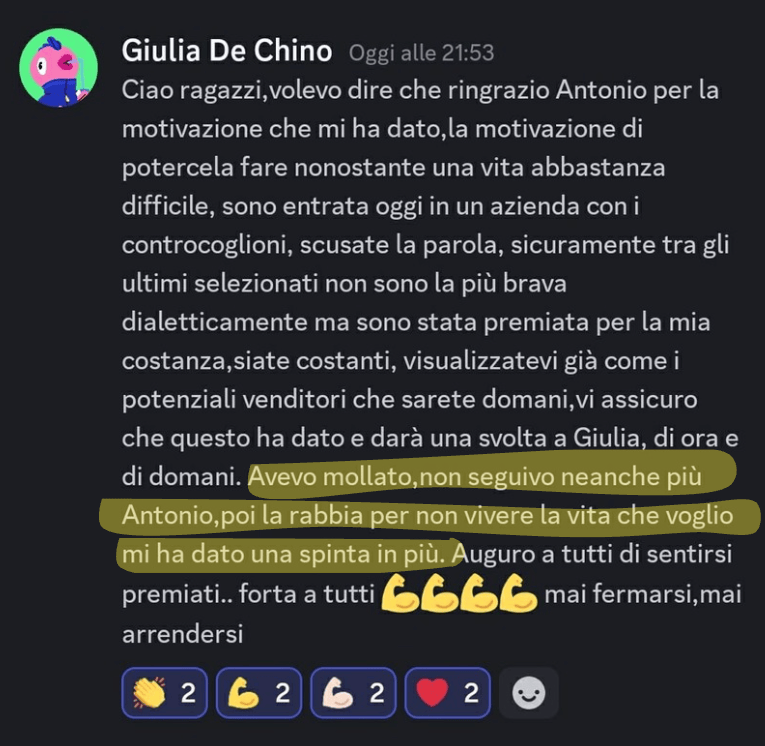 “Sono entrata in azienda da pochi giorni e ho già iniziato a chiudere le mie prime trattative. All’inizio avevo paura di non essere all’altezza, ma ho seguito passo dopo passo ogni consiglio del programma… e i risultati sono arrivati subito. Oggi mi sento più motivata, sicura e pronta a crescere ancora.”